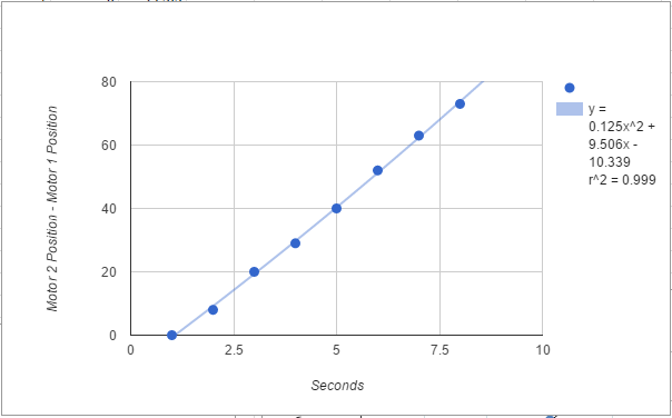 You can see how inconsistent one motor is, imagine trying to get two of them to work together! Next, we ran a program that printed out the positions of both motors after each second. We noticed that motor 1 was much slower than motor 2. We thought it would be interesting to plot the relationship. Below, you can see that the difference in motor position vs. time fits a quadratic relationship. We thought that perhaps we could use the equation generated to determine how much to adjust the speeds of the two motors in order to make the SciBorg drive a straight line. That's definitely not bang-bang control, though, so we'll save it for another time.